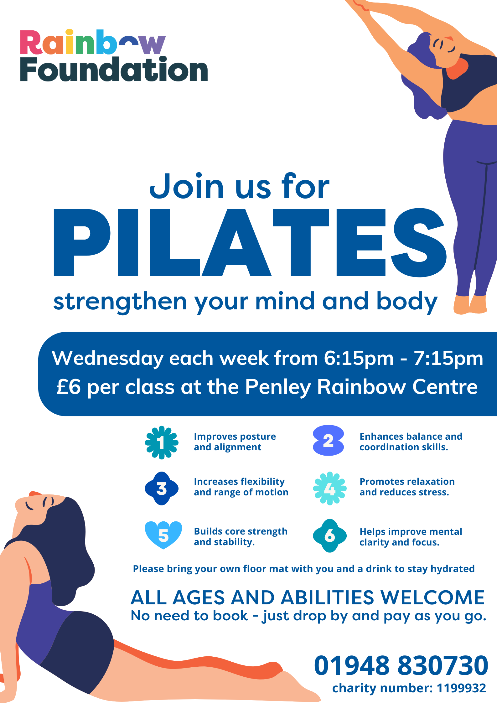 Meeting Wednesday each week from 6:15pm – 7:15pm at the Rainbow Centre in Penley, our Pilates class allows participants to strengthen their mind and body.